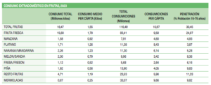 En 2023, el consumo extradoméstico de frutas en España alcanzó los 16,5 millones de kilos, con un consumo medio de 1,6 kilos per cápita al año. Un 30,5% de los consumidores entre 15 y 75 años declaró haber consumido fruta en alguna ocasión fuera de casa.