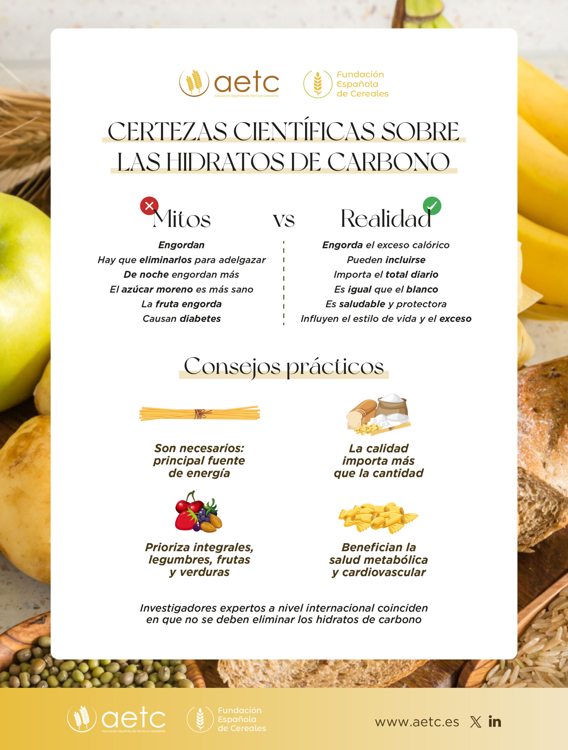 Madrid, 26 de enero de 2026.- Frente a la creciente demonización de los hidratos de carbono en redes sociales y algunos discursos mediáticos, la evidencia científica es clara: no son el enemigo, sino un componente imprescindible de una alimentación saludable. Así lo recoge el argumentario elaborado por la Asociación Española de Técnicos Cerealistas (AETC), con el apoyo del grupo de investigación InnograinLab de la Universidad de Valladolid, cuyo objetivo es aclarar, con base científica, algunos de los mitos más extendidos en torno a este grupo de nutrientes.