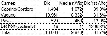 También aumenta el ajetreo en el mercado de las carnes de cara a Navidad. Las mejores piezas nobles de vacuno, corderos y cabritos enteros, en medias canales o cuartos de canal, se convierten en auténticos reyes de la mesa y son dos de las especies donde más impacto tiene en ventas el aumento de consumo. Estos dos mercados, llegan a crecer entre un 30 y 40% respecto a la media del resto del año. Y qué decir del lechón, pues que en estas fechas su comercialización se dispara igualmente respecto a la media del año en más de un 1.200% concentrándose tan solo en diciembre más del 60% de la actividad de todo el año. Dentro de las aves, el pavo y las especies de corral son por las que más se decanta la demanda.