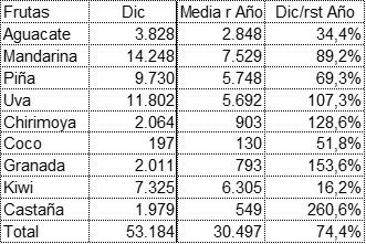 En Frutas, es tiempo de granadas, mandarinas, piñas, uvas, chirimoyas, aguacates o castañas, cuyo mercado en diciembre llega a crecer, por término medio, un 75% respecto a la media del resto del año.