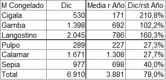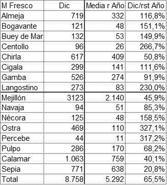 La compra de mariscos y cefalópodos, se dispara cuando llega diciembre y las Navidades. La venta de fresco crece más de un 65% sobre la media del resto del año y la de congelado, un 80%, este último un recurso ideal y más asequible para la compra de algunos productos. No solo se dispara la demanda de aquellas especies más selectas que prestigian las mesas sino de aquellas más habituales o populares de venta más frecuente durante el resto del año como chirlas, mejillones, pulpos, calamares o sepias cuyas operaciones aumenta más de un 50% respecto al resto del año. Y qué decir de aquellos más selectos donde la comercialización de ostras, vieiras, centollos y percebes se llega a cutriplicar y en otras como almejas, bogavante, gamba, nécora…como mínimo se duplica.
