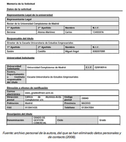 Una de las primeras controversias que surgieron fue la denominación del nuevo grado que recuperaba la tradición de las enseñanzas de comercio, decisión que fue ampliamente discutida en el seno de las Escuelas de Estudios Empresariales. En la Escuela de la Universidad Complutense de Madrid, en un primer momento se acordó que el nuevo grado se llamaría Grado en Gestión Comercial, como se puede observar en la figura 2, documento que recoge un extracto de la primera memoria de solicitud que se redactó para su envío a la ANECA y que data de 13 de noviembre de 2008 (ver figura 2).
