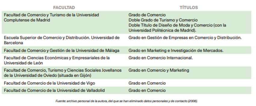 Unos años más tarde, las Escuelas Universitarias de la Universidad Complutense pasan a tener el estatus de Facultad a través de la Orden Autonómica de creación que se publicó en el Boletín Oficial de la Comunidad de Madrid el 16 de noviembre de 2012. Asimismo, en toda España hubo un proceso similar de conversión de las antiguas Escuelas Universitarias en Facultades. En la actualidad existen cinco Facultades en cuya denominación que se incluye el término “comercio”, a saber, la Facultad de Comercio y Turismo de la Universidad Complutense de Madrid, la Facultad de Comercio y Gestión de la Universidad de Málaga, la Facultad de Comercio, Turismo y Ciencias Sociales Jovellanos de la Universidad de Oviedo, la Facultad de Comercio de la Universidad de Vigo y la Facultad de Comercio de la Universidad de Valladolid, que ofrecen diversos grados relacionados con el grado en comercio (ver tabla 1). Además, la Universidad de Barcelona, aunque no tiene Facultad de Comercio ofrece el Grado en Gestión de Empresas en Comercio y Distribución a través de la Escuela Superior de Comercio y Distribución, y la Universidad de León ofrece el Grado en Comercio Internacional (ver tabla 1).