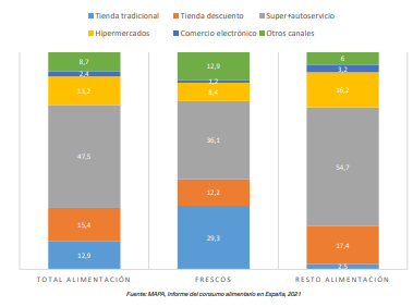 Aparte de documentar el importante cambio estructural que se ha producido en la organización de la cadena alimentaria, con los supermercados protagonizando la distribución, estos datos nos ayudan a darnos cuenta de que hay sustanciales diferencias entre la alimentación fresca y el resto. Por ejemplo, a pesar del retroceso de las tiendas tradicionales, en fresco aún suponen el 29,3% del volumen vendido, por sólo el 2,5% del resto de la alimentación. Algunas de las razones que la literatura aporta a esta realidad tienen que ver con las dificultades que para empresas especializadas en grandes volúmenes plantean unos productos frescos que requieren unas condiciones de manipulación, envasado y transporte muy especiales. Los productos frescos son perecederos y, por tanto, el tiempo de viaje influye en la calidad real y la percibida por el consumidor, además de que requieren mantener la cadena de frío y, en ocasiones, una atmósfera controlada. Por último, su distribución en grandes volúmenes puede tener repercusiones sobre los precios en los mercados de destino por la vida útil limitada (Uclés, 2017).