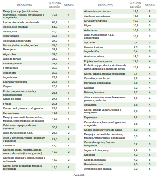 CUADRO 1. Productos en los que España se sitúa entre los 10 primeros puestos mundiales en volumen producido, año 2020.