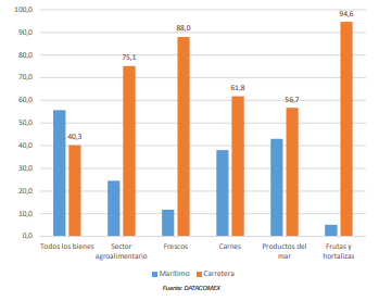 La primera evidencia es que, mientras que el transporte marítimo es la opción mayoritaria para el comercio internacional español, con un 55,7% del volumen exportado por España, la carretera es, para el sector agroalimentario, el modo más utilizado: tres cuartas partes del volumen vendido sale de España en camión. Para el caso de los frescos (frutas y hortalizas frescas, carnes y productos del mar), el camión casi alcanza el 90% del volumen, y para las frutas y hortalizas frescas llega al 94,6%.