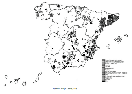 Una aproximación diferente, pero de conclusiones similares, es la de Boix y Galleto (2005), quienes, a través del análisis del mercado de trabajo, llegan a un mapa de distritos industriales y sistemas productivos locales (Figura nº 1), en la que identifican 237 distritos industriales en la España de 2001, de los que 52 pertenecen a la industria alimentaria, sólo por debajo de los dedicados a textil y confección. La limitación de este estudio es que no tiene en cuenta distritos basados en la agricultura y la ganadería, lo que aumentaría significativamente esta cifra.