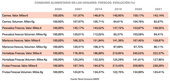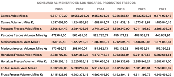 Los parámetros de las compras de alimentos por parte de los hogares han evolucionado de forma distinta según grandes grupos, capítulos y epígrafes en lo que va del siglo XXI. La dimensión de este artículo no permite profundizar este análisis, pero nos resulta imprescindible aportar algunas cifras generales de los productos frescos por un lado y, más adelante, señalar brevemente algunas cuestiones de capítulos muy importantes, así como los principales efectos en los subsistemas alimentarios correspondientes.