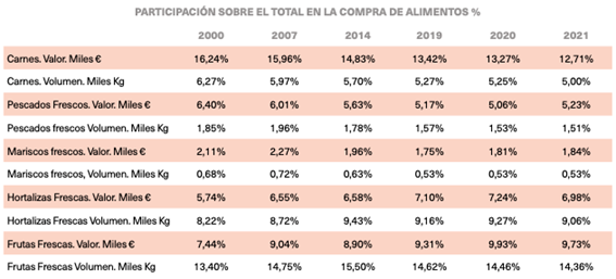 La participación de las carnes en la compra de los hogares ha caído desde el 16,4% en valor y el 6,27% en volumen del año 2000 hasta el 12,71% en valor y 5% en volumen correspondiente al año 2021. Esta caída en la participación de las carnes se observa a lo largo de todo el periodo y es coherente con la tendencia a reducir las proteínas de origen animal que se observa en los países más desarrollados. El volumen de carne adquirida subió hasta 2007 y desde entonces ha ido disminuyendo, de forma que la cifra de 2021 es inferior a la del año 2000.