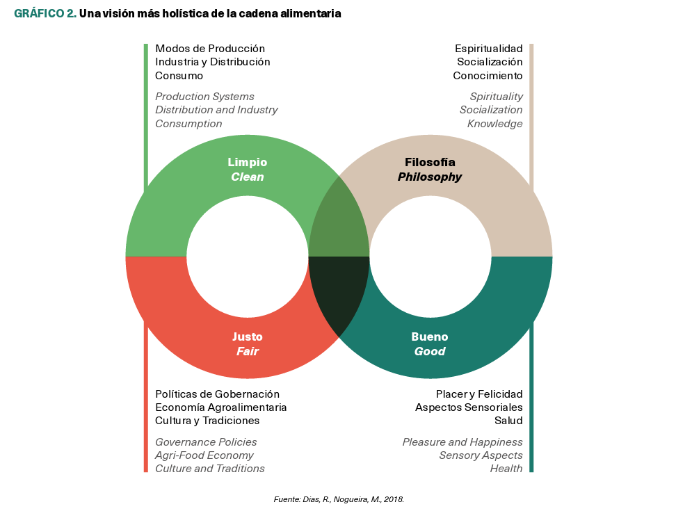 En cuanto al principio “bueno”, este representa la búsqueda consciente por parte de los consumidores de alimentos de origen y sabor genuinos, es decir, la demanda de dietas con alimentos frescos, de temporada, con cualidades organolépticas y nutritivas, resultado de sentidos educados y entrenados. Este modelo predice que esta dimensión se explica por tres factores: placer y felicidad, aspectos sensoriales y salud. (Real, H., Dias, R. R., & Graça, P. 2020).