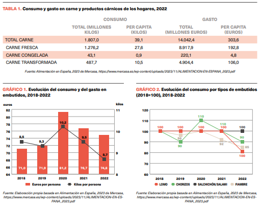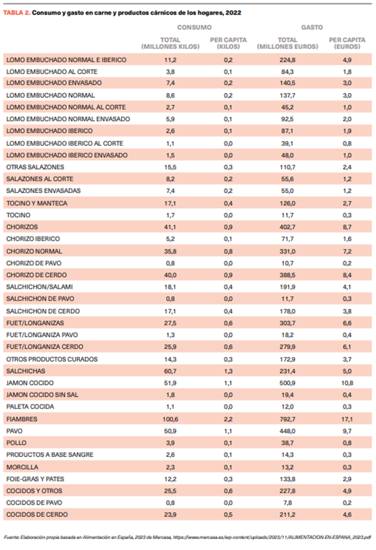 Conforme al último dato anual disponible, los hogares españoles consumieron 1.807,0 millones de kilos de carne y productos cárnicos y gastaron 14.042,4 millones de euros. En términos per cápita, se llegó a 39,1 kilos de consumo y 303,6 euros de gasto tal y como detalla el tabla 1.