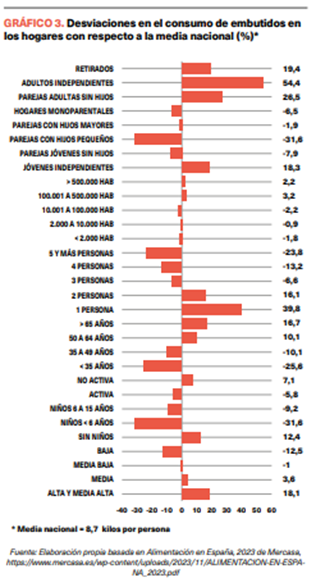 • Los hogares formados por una persona muestran los consumos más elevados de embutidos, mientras que los índices son más reducidos a medida que aumenta el número de miembros en el hogar.