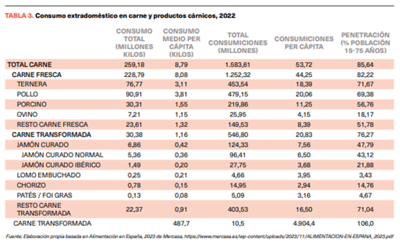 Los últimos datos anuales disponibles indican que el consumo extradoméstico de carne y productos cárnicos fue de 259,2 millones de kilos, que suponen 8,8 kilos per cápita en esta familia de productos. Las consumiciones en carne y derivados ascienden a 1,583,6 millones –de forma concreta, 53,7 por persona-. Durante el último año, un 85,6% de consumidores entre 15 y 75 años han tomado carne o productos cárnicos en alguna consumición fuera del hogar.