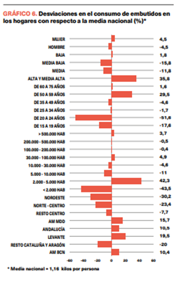 Finalmente, el gráfico 6, en términos per cápita, recoge las desviaciones en la demanda de carne transformada donde está recogida, de una manera muy significativa, la familia de los embutidos: