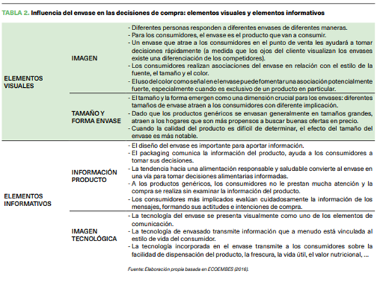 Una revisión de la literatura especializada indica que hay cuatro elementos principales del envase que pueden afectar a las decisiones de compra de los consumidores. Se pueden separar en dos categorías: elementos visuales y elementos informativos. Los elementos visuales consisten en imagen y tamaño/ forma del envase mientras que los elementos informativos se refieren a la información del producto y a la imagen tecnológica. Todos estos argumentos son reflejados en el tabla 2.