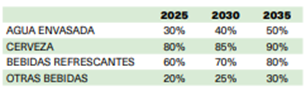 • La proporción de envases reutilizables comercializados en canal doméstico respecto al total de envases en peso de esta categoría, deberá ser del 5% en 2030 y del 10% en 2035.