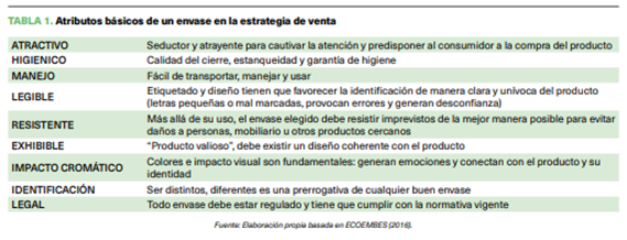 Los principales atributos del envase en la estrategia de comercialización aparecen recogidos en el tabla 1 mientras que, con carácter general, la importancia del envase para la actividad de venta queda sintetizada en los tres puntos siguientes: