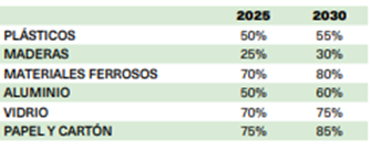 En cuanto al reciclado por materiales específicos, los objetivos mínimos (en %) son los siguientes: