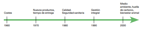 Refiriéndonos al caso español, una vez abordado el abastecimiento de productos básicos, en la década de los sesenta la preocupación esencial eran los costes. (Briz J., De Felipe I., 2013). En la década siguiente se buscan nuevos productos y el tiempo de entrega (just in time) en el momento y lugar adecuado, lo que fomenta las plataformas de abastecimiento. En los 80, la seguridad sanitaria y la calidad del producto reciben especial atención. En los 90 se enfoca la gestión integral de la cadena alimentaria. En el siglo XXI se ha ampliado el abanico de actuaciones a escenarios relacionados con el medio ambiente, conservación de recursos naturales, huella de carbono o bienestar animal. (Figura 1).
