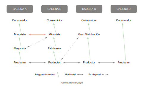 En una economía de libre mercado, cada eslabón de la cadena desarrolla unas funciones que pueden ser asumidas por diferentes actores, según sus posibilidades. Los agricultores pueden comercializar e industrializar sus productos cuando se agrupan en cooperativas. Los consumidores pueden tener economatos, entidades que facilitan su abastecimiento, y así sucesivamente. Los mercados mayoristas pueden actuar como minoristas y elaborar productos.