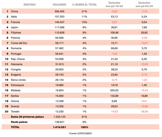 CUADRO 6. Principales destinos de las exportaciones españolas de carne, despojos y grasas de porcino en enero-julio 2024 (toneladas