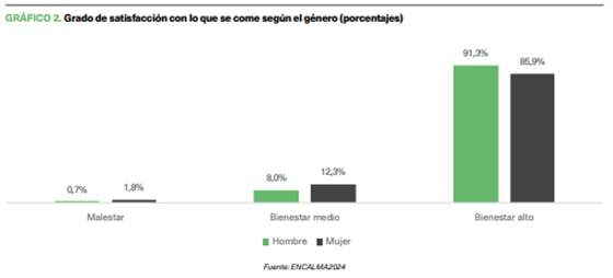 Como se puede ver, tanto hombres como mujeres muestran altos niveles de satisfacción con los alimentos que comen. Específicamente, un 91% de los hombres y un 86% de las mujeres se ubican en la categoría de “bienestar alto”. Estos porcentajes reflejan una satisfacción general elevada, destacando una mayor satisfacción entre los hombres, que superan a las mujeres en 5 puntos porcentuales.