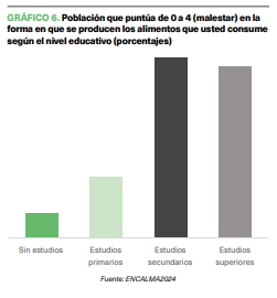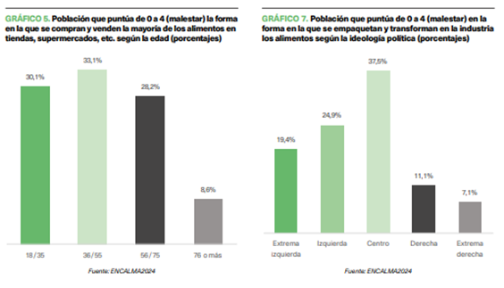 Se evidencia que el malestar con la industria alimentaria es más pronunciado entre aquellos que se identifican con una ideología de centro (37,5%), aunque quienes se perciben de izquierdas superan esta cifra (44,3%).