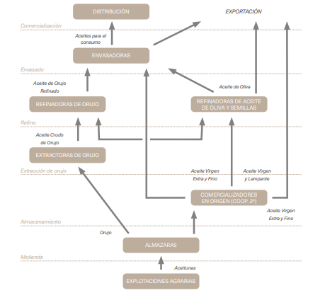 El sistema de producción de aceite de oliva da lugar a tres productos finales diferenciados que cuentan con cadenas de producción específicas, siendo algunas de las fases comunes y otras específicas de cada una de ellas. Estos tres productos son el aceite de oliva virgen y virgen extra, el aceite de oliva y el aceite de orujo de oliva. La elaboración de todos estos productos requiere la participación de agricultores, almazaras y envasadores; el aceite de oliva requiere también la participación de refinadoras y el aceite de orujo de oliva precisa de la intervención de extractoras y refinadoras de orujo.
