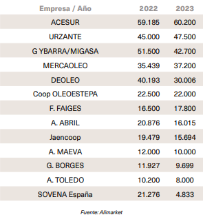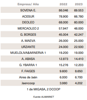En definitiva, el sector cuenta en la actualidad con cinco grandes empresas en su cabecera, con facturaciones en el sector cercanas o superiores a los 700 millones de euros, las dos mayores son dos firmas familiares andaluzas con presencia en más países mediterráneos, Migasa (1.860 millones de euros de facturación en 2023) y Acesur (1.150 millones de euros de facturación 2023), hay una empresa de capital portugués con gran presencia internacional, Sovena (775 millones de euros de facturación 2023), una gran cooperativa oleícola, DCOOP, con presencia también en terceros países, y Deoleo (837,6 millones de euros de facturación 2023), que está abandonando su actividad industrial y sigue pendiente de la salida del fondo CVC de su capital. Todas ellas son grandes exportadoras, envasan, cuentan con marcas propias y hacen MDD y, a excepción de Dcoop (1,409,3 millones de euros de facturación en 2023 incluyendo otros sectores), trabajan con aceites de oliva y semillas.