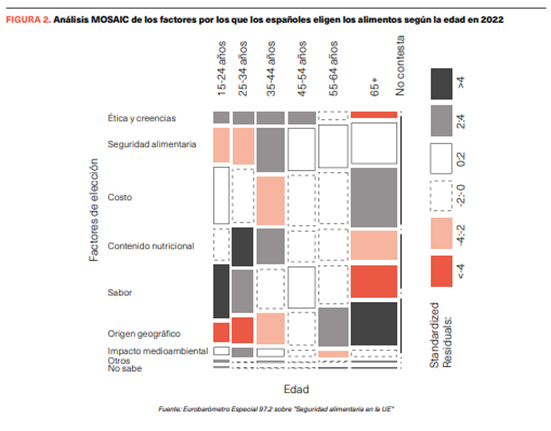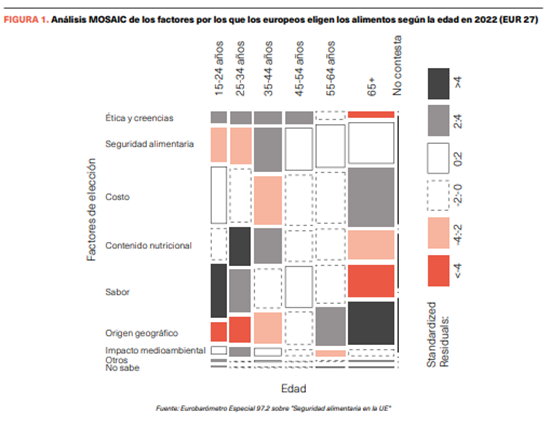 El origen geográfico de los alimentos presenta una clara tendencia ascendente con la edad, tanto en la tabla como en el gráfico MOSAIC. El área correspondiente a este factor crece visiblemente de izquierda a derecha en el MOSAIC, reflejando el aumento del 8,6% en los más jóvenes al 19,6% en los mayores de 65.