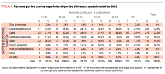 Al analizar los datos específicos para España, observamos patrones interesantes en la forma en que los diferentes grupos de edad priorizan los factores de elección de alimentos, algunos de los cuales difieren de las tendencias generales europeas (Tabla 2 y Figura 2).