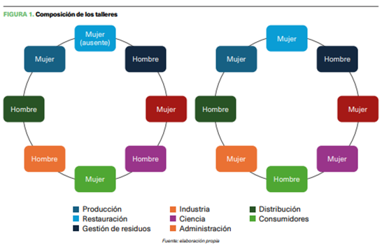 En estos talleres estuvieron presentes representantes de cada sector del sistema agroalimentario: productores, industria, distribución, restauración, consumidores, gestores de residuos, administración pública y ciencia. Se buscó una representación equilibrada en términos de género. La configuración de la muestra final se puede observar en la Figura 1. Composición de los talleres.