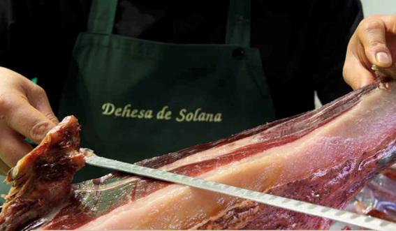 Calar un jamón no es tarea fácil. Esta técnica se realiza a través de unas manos expertas y de un olfato muy selectivo, como afirma que el director comercial de Dehesas Reunidas, Juan Menéndez Nieto, “en la que se debe respetar las enseñanzas de antaño pero con la ayuda de nuevas tecnologías”. Cada una de las piezas que salen de las bodegas pasa por las manos del maestro artesano de esta empresa, el calador Antonio Miguel Alejandre, quien afirma que “no podemos dar por hecho que un jamón no evoluciona con el tiempo y la temperatura, por eso es mejor antes de empezar cualquier pieza calarla con la mínima penetración y en los sitios propicios donde se debe calar, tocar la maza y babilla para ver que está en condiciones óptima para su corte».