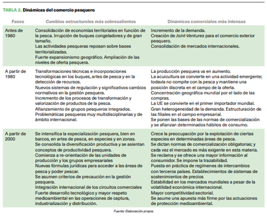 Las consecuencias de dichos cambios y alteraciones derivadas de los nuevos marcos jurídicos explicitan las nuevas y distintas trayectorias seguidas por las flotas y agentes económicos. Destacan tres fases históricas en el comercio pesquero mundial: la etapa expansionista; la fase dominada por la diversificación y especialización; y el periodo globalizador.
