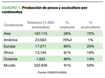Por áreas geográficas, Asia alberga los cuatro principales países productores y, en cada uno de ellos, la mayor parte de la producción procede de la acuicultura. Esto es, la acuicultura supone el 85% de la producción de China y el 66% en la de Indonesia. Los porcentajes en el caso de India y Vietnam son del 65% y del 60%, respectivamente. Por otro lado, en América, Europa y África, la acuicultura alcanza participaciones más reducidas y supone cerca del 20% de la producción total. Las principales cifras de participación por continentes se reflejan en el cuadro 1.