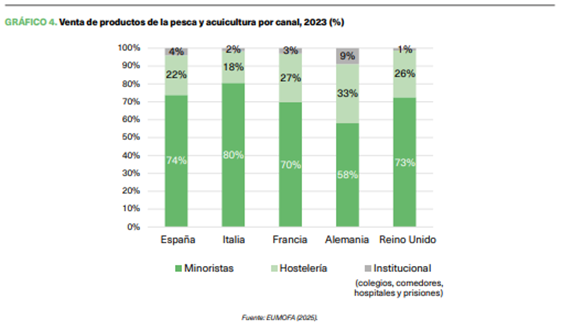 Finalmente, también resulta interesante recordar que la industria de la pesca y de la acuicultura suministran sus productos a los consumidores a través de diferentes canales de venta. Desde el Informe de EUROMOFA (2025) se diferencian el canal minorista, que incluye principalmente pescaderías y minoristas a gran escala; los servicios de restauración, que abarcan catering, restaurantes y venta para llevar; y los canales institucionales, que incluyen colegios, comedores, hospitales y prisiones. Para los casos de España, Italia, Francia, Alemania y Reino Unido se recaba información en el gráfico 4 sobre la participación de los diferentes canales de suministro anteriormente referidos.