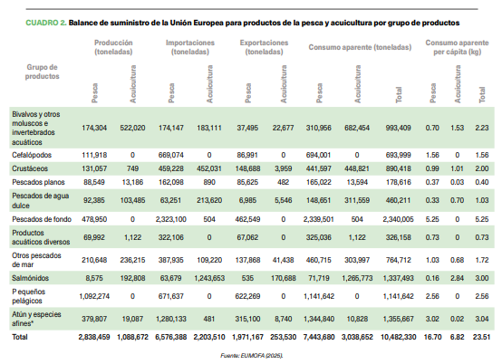 Por otra parte, el cuadro 2 resume el consumo aparente por grupos de productos conforme a su relevancia en la Unión Europea. En este cuadro aparece información desglosada por producción, importaciones y exportaciones para, finalmente, calcular el consumo aparente.