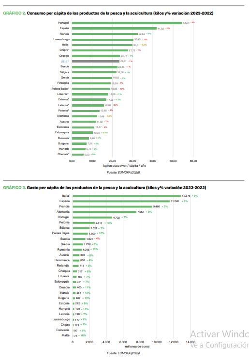 De acuerdo con los datos de EUMOFA (2025), Portugal destaca como el principal consumidor de la Unión Europea en productos de la pesca y de la acuicultura aunque ha experimentado un retroceso desde el año 2018 (alcanzó un consumo per cápita de 61,0 kilos que en la actualidad se cifra en 54,5 kilos per cápita). Este descenso refleja la tendencia general observada en otros países de la Unión Europea, la mayoría de los cuales registraron una caída del consumo entre 2021 y 2022. No obstante, también hay que señalar que en otros países la tendencia ha sido diferente (por ejemplo, en Hungría, Rumanía o Eslovaquia viene produciéndose un incremento continuado durante todos los años de la última década).