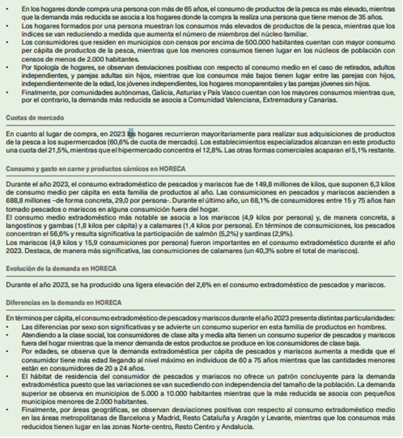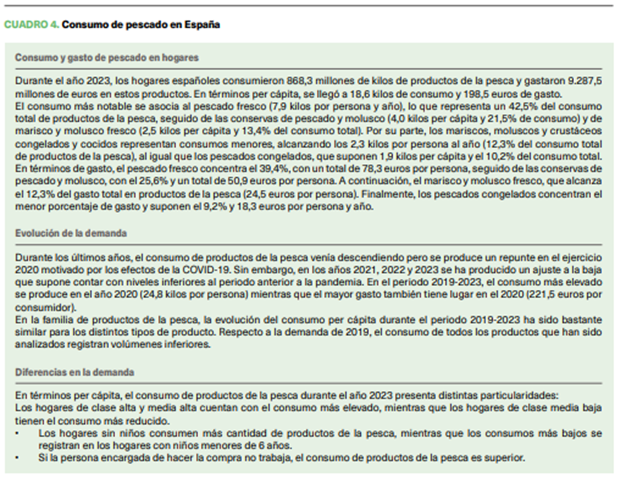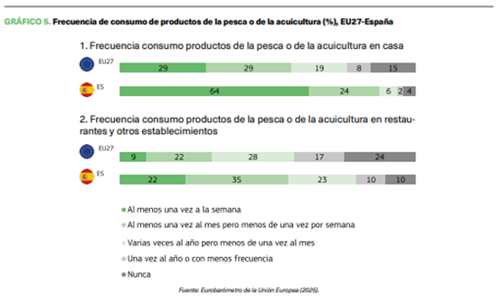 EUROBAROMETRO DE LA UNIÓN EUROPEA (2025): EU consumer habits regarding fishery and aquaculture products, disponible en https://europa.eu/eurobarometer/ surveys/detail/3213, consultado el 31/03/2025 EUROMOFA (2025): El mercado pesquero de la Unión Europea. Edición 2024, Disponible en https://eumofa.eu/documents/20124/35683/European+Union.pdf/f6357f0b45c1-4f55-b08c-78ab773b9eae?t=1700837229916, consulado el 31/03/2025 MAPA (2025): Datos de consumo alimentario, Ministerio de Agricultura, Pesca y Alimentación, Disponible en https://www.mapa.gob.es/es/alimentacion/temas/consumo-tendencias/panel-de-consumo-alimentario/default. aspx, consultado el 31/03/2025 MERCASA (2025): Alimentación en España 2024. Producción, industria, distribución y consumo. Mercasa. Disponible en https://www.mercasa.es/publicaciones/alimentacion-en-espana/, consultado el 31/03/2025