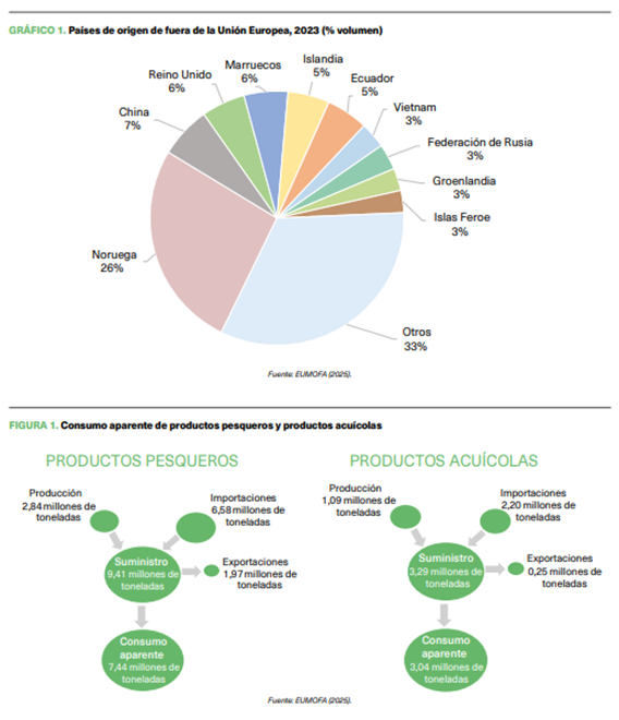Atendiendo a la participación de la Unión Europea, la producción pesquera y acuícola total fue de cerca de 4,5 millones de toneladas, que representaron más de un cuarto de la producción europea (EUROMOFA, 2025). La Unión Europea contabilizó el 25% de las capturas europeas totales y, en el caso de la acuicultura, concentró el 31% de la producción acuícola europea.