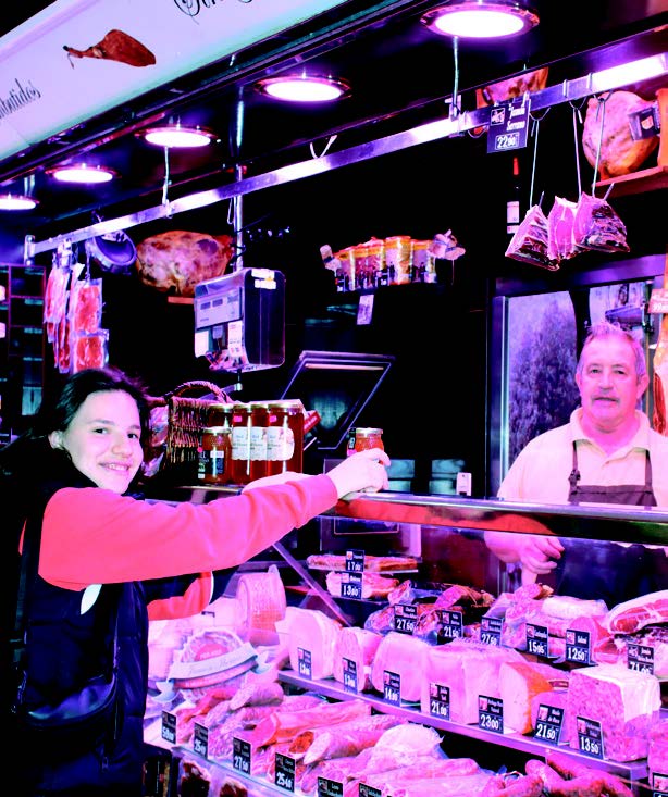 Las charcuterías también son muy representativas del mercado. El producto estrella es el jamón en todas sus variedades, calidades y precios. Todos los charcuteros son expertos cortadores de jamón. La clientela tiene la seguridad de asistir al corte exacto de lo que compra, no hay trampa ni cartón. Esta seguridad es el valor de la charcutería de mercado, sin condimentos ni añadidos. El único inconveniente es el tiempo de espera en el corte, por eso, algunos de ellos han empezado a cortar las piezas más demandadas previamente y empaquetarlas al vacío. De esta forma, el cliente lo recibe al momento, preparado solamente unos minutos u horas antes.