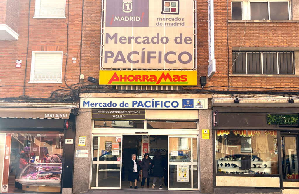 El Mercado de Pacífico ocupa la planta baja y los dos primeros pisos del edificio residencial en el que está integrado. Hace décadas que todos los comerciantes se concentraron en la planta a pie de calle, instalándose en la primera planta un supermercado de la insignia Ahorra Más. La relación entre los comerciantes y el supermercado no es demasiado simbiótica, cada espacio comercial sigue su propia senda. De hecho, todos son arrendatarios de la familia gestora, no existe un órgano de representación colectivo de todo el conjunto comercial. Y, sin embargo, visitando el mercado, es evidente que mercado y supermercado se retroalimentan. Los vecinos tienen la oportunidad de realizar una compra integral de calidad, posibilidad muy apreciada por los clientes del mercado.