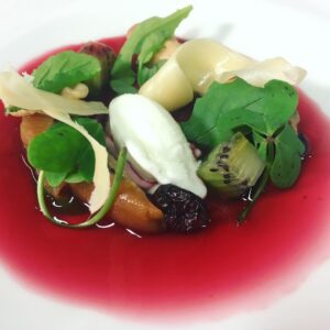 Este postre se monta sobre la base de pequeños puntos de puré de kiwi reforzado con pequeños cuadraditos de kiwi natural. Al mismo tiempo, podemos cocinar otro kiwi en una cazuela al vapor, durante dos horas a temperatura muy suave para conseguir modificar la textura de esta fruta y, por consiguiente, el sabor. El nuevo sabor torrefacto se asocia entonces a la nuez. A continuación se añaden los arándanos, las hojas de rúcula fresca, la oxalis.