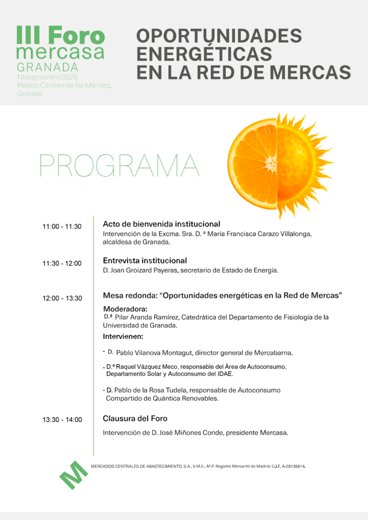 La jornada dará comienzo a las 11 horas con el acto de bienvenida a través de la intervención de Marifrán Carazo Villalonga, alcaldesa de Granada y continuará con una entrevista a Joan Groizard Payeras, secretario de Estado de Energía. La mesa redonda con el tema “Oportunidades energéticas en la Red de Mercas” estará moderada por Pilar Aranda Ramírez, catedrática del Departamento de Fisiología de la Universidad de Granada y ex rectora de la Universidad de Granada, y en la que participarán expertos como Pablo Vilanova Montagut, director general de Mercabarna; Raquel Vázquez Meco, responsable del Área de Autoconsumo, del Departamento Solar y Autoconsumo del Instituto para la Diversificación y Ahorro de la Energía (IDEA) y Pablo de la Rosa Tudela, responsable de Autoconsumo Compartido de Quántica Renovables. A final de la mañana, clausura José Miñones Conde, presidente de Mercasa.