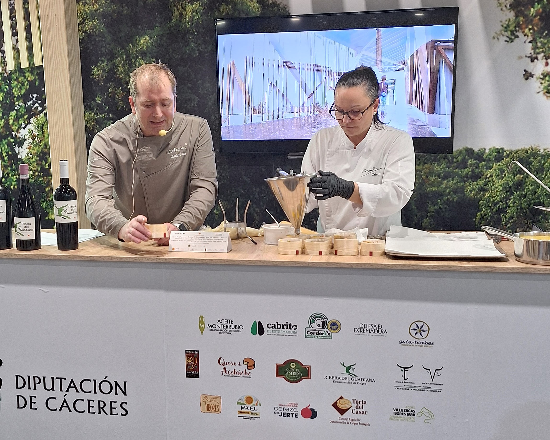 Por su parte, Juan Santiestebán, cocinero del restaurante La Fabiola, en Cáceres, preparará un bombón de Torta del Casar, Cereza de Jerte guisada y tierra de Aceite de Villuercas-Ibores. El primer plato se ha presentado en el stand de las diputaciones extremeñas este lunes, 26 de enero, y el segundo se preparará el miércoles a las 13:30 horas.