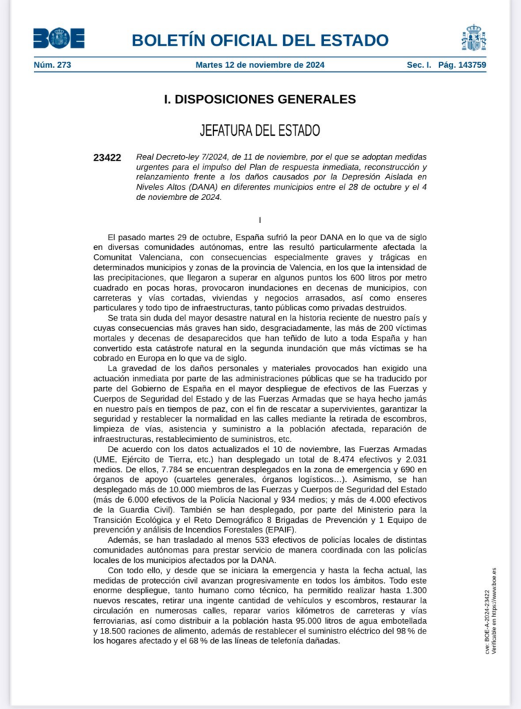 Publicado el Real Decreto-ley 7/2024, de 11 de noviembre, por el que se adoptan medidas urgentes para el impulso del Plan de respuesta inmediata, reconstrucción y relanzamiento frente a los daños causados por la DANA