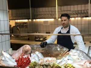 A continuación, y tras echar sal y aceite al pescado crudo, éste se marca en la parrilla.