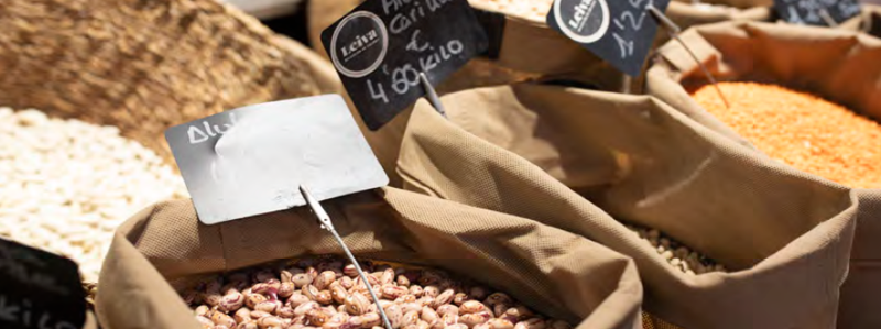 En cuanto al lugar de compra, en 2024 los hogares recurrieron mayoritariamente para realizar sus adquisiciones de legumbres a los supermercados (71,7% de cuota de mercado). Los hipermercados alcanzan en estos productos una cuota del 15,8% y los establecimientos especializados llegan al 5,5%. El comercio electrónico supone el 2,8% y los mercadillos el 0,6%, mientras que las otras formas comerciales alcanzan el 3,6% restante.