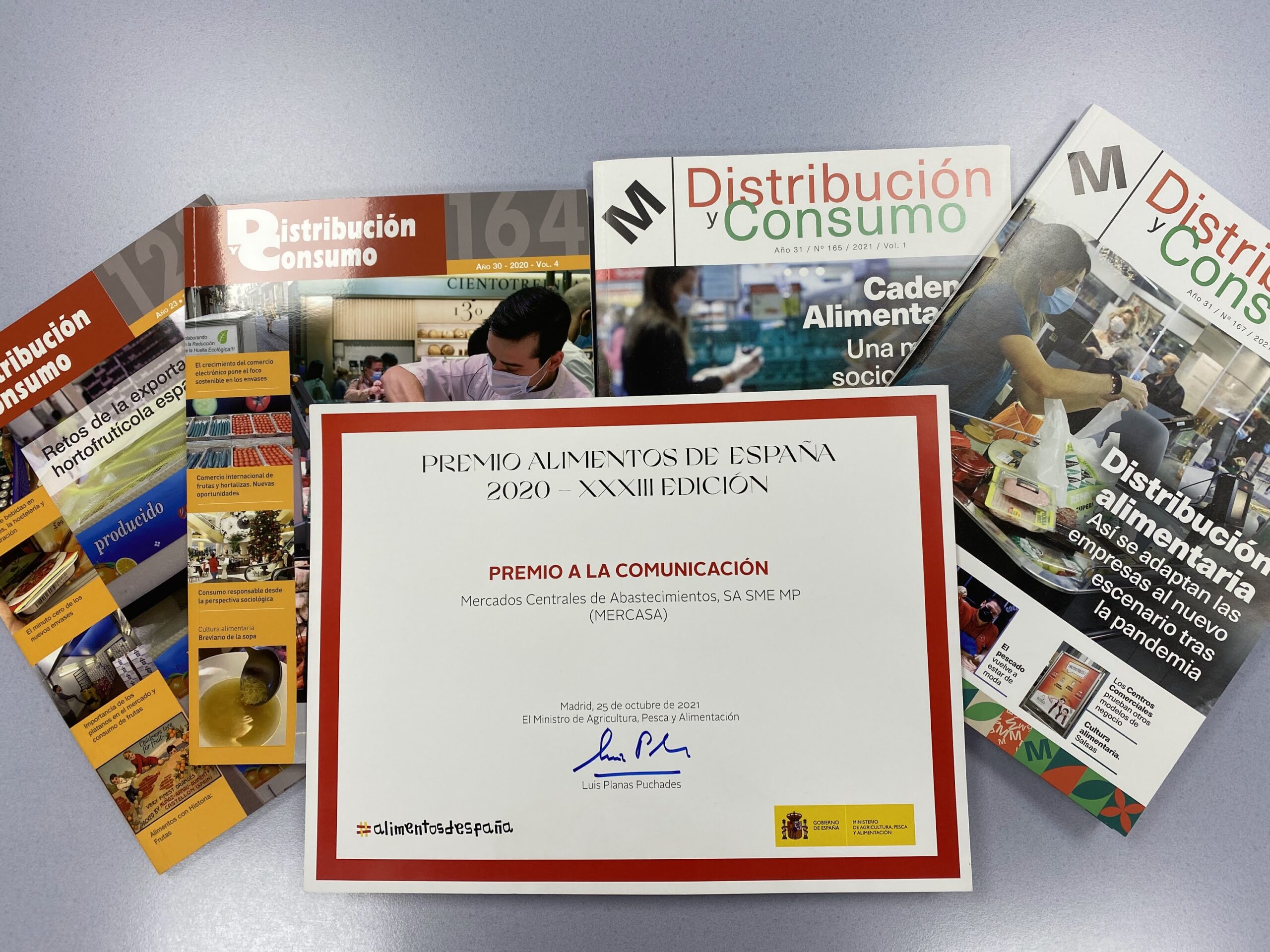 El Ministerio de Agricultura, Pesca y Alimentación otorgó a Mercasa el Premio Alimentos de España de Comunicación, por la edición de la revista Distribución y Consumo, destacando en este reconocimiento que “es una de las publicaciones más veteranas y de reconocida trayectoria en el sector agroalimentario español, en la que ha demostrado un rigor indiscutible, con información de calidad y puntos de vista relevantes”.